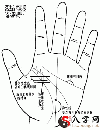 爱情线:自小指旁边(pangbian)开始为男(二十岁),女(18岁),小拇指正中间(zhengzhongjian)的爱情线为女(23)男(25),biede别的类推。