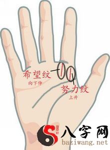 核心要点(yaodian)上往上走(wangshangzou)的纹(xiamian下面的图中深蓝色斜线所显示),表明qinfen勤奋会出现成效(chengxiao);若在核心要点(yaodian)起始点往(dianwang)无名指下升叫“期待纹”。有期待纹的人,梦越大运势越好。